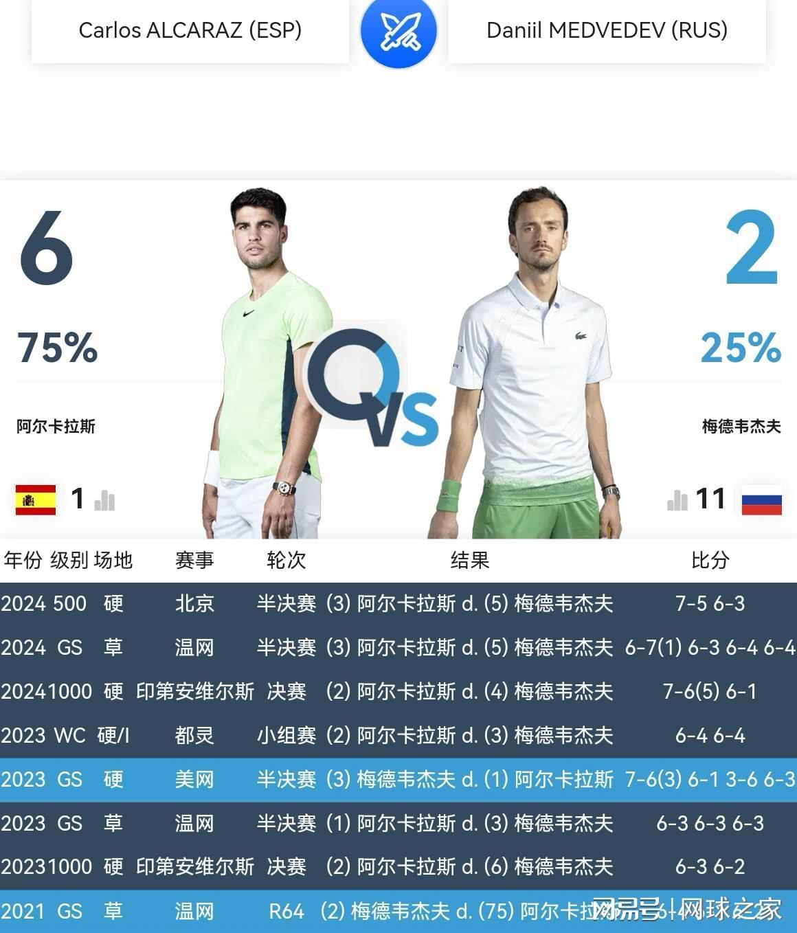 职业生涯至今,梅德维德夫与阿尔卡拉斯交锋八次,二胜六负,完全处于下风,而且处在一波四连败之中。更加引人注目的是,正是在2023、2024年印第安维尔斯大师赛决赛,阿尔卡拉斯连续两年战胜梅德维德夫,夺取冠军。